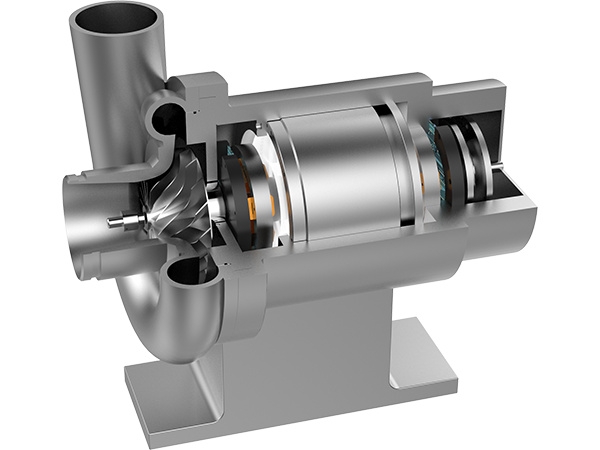 磁懸浮鼓風機是采用磁懸浮軸承的透平設備的一種。其主要結構是鼓風機葉輪直接安裝在點擊軸延伸端上,而轉子被垂直懸浮于主動式磁性軸承控制器上。不需要增速器及聯軸器,實現由高速電機直接驅動,由變頻器來調速的單機高速離心鼓風機。該類風機采用一體化設計,其高速電機、變頻器、磁性軸承控制系統和配有微處理器控制盤等均采用一體設計和集成。其核心是磁懸浮軸承和永磁電機技術。