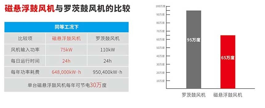 ◇ 與羅茨鼓風(fēng)機(jī)相比,磁浮鼓風(fēng)機(jī)的效率提高了30%以上。